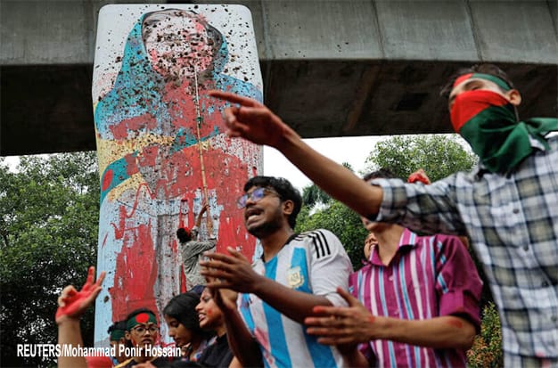 Picture shows protesters shouting slogans as they vandalise a mural of Prime Minister Sheikh Hasina in Dhaka.